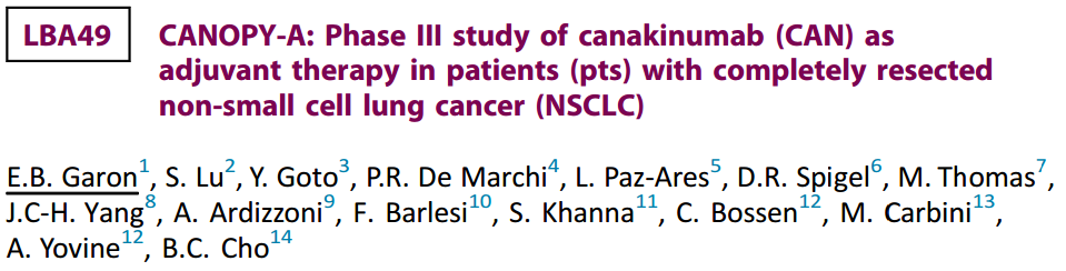 LBA49 - Canakinumab辅助治疗完全切除的非小细胞肺癌的III期CANOPY-A研究