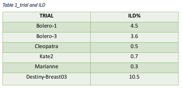 随着抗体偶联药物(ADC)T-DXd治疗晚期乳腺癌(MBC)一系列研究结果的公布,在其惊艳的疗效得到广泛认可的同时,也让一个特殊的不良反应——药物诱导的间质性肺病(ILD)引起了关注。T-DXd在DESTINY-Breast01研究中取得的卓越疗效,使其被FDA快速批准了HER2阳性MBC后线治疗适应症,在随后的DESTINY-Breast03研究中,T-DXd的PFS和ORR均明显优于T-DM1,使其再添HER2阳性MBC二线治疗适应症。该研究通过网状meta分析的方法,提示T-DXd诱导的ILD发生率明显偏高,DESTINY-Breast01中为15.2%,其中4例患者死亡;DESTINY-Breast03研究中为10.5%。BOLERO-1和BOLERO-3研究在化疗联合曲妥珠单抗的基础上联合mTOR抑制剂依维莫司,在主要研究终点PFS延长的同时,ILD的发生率也明显升高,分别为4.5%和3.6%。