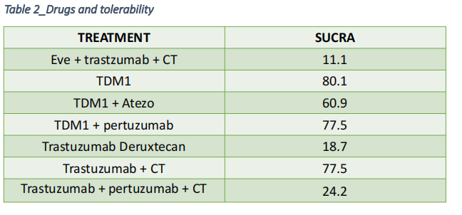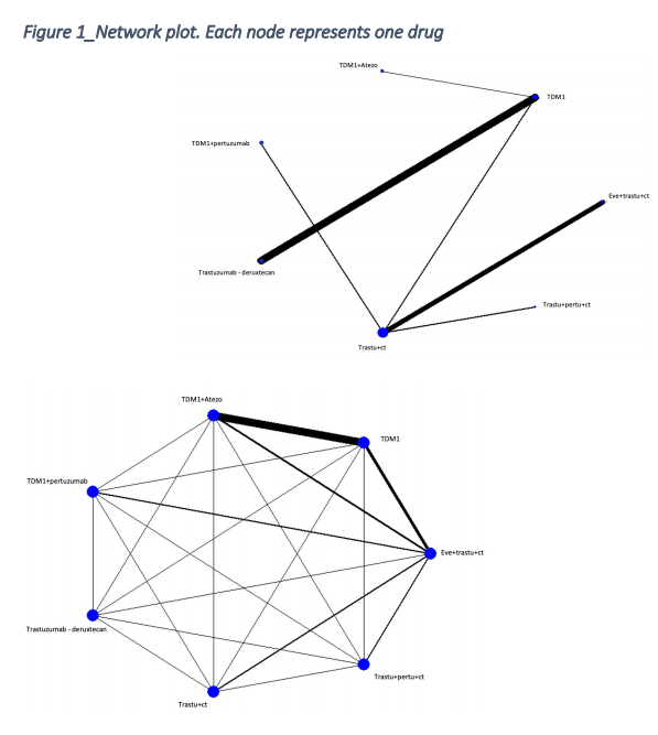 研究方法:在系统查阅文献后,使用STATA软件(第17版),运用马尔可夫链蒙特卡洛模拟方法进行贝叶斯网状meta分析。治疗方案分为:曲妥珠单抗(H)+化疗(CT)、H+帕妥珠单抗(P)+CT、依维莫司(Eve)+H+CT、T-DM1、T-DM1+P、T-DM1+阿替利珠单抗(Atezo)和T-Dxd。结果以相应的95%可信区间(CrIs)报告。利用累积排序曲线(SUCRA)下的面积进行排名。