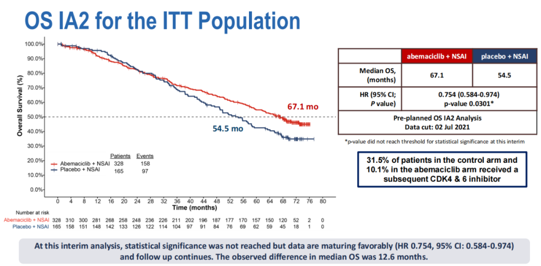 在第二次中期分析时,中位随访70.2个月。在ITT人群中,阿贝西利+NSAI组的中位OS(mOS)为67.1个月,安慰剂+NSAI组的mOS为54.5个月(HR=0.754,95%CI:0.584-0.974,双侧P=0.0301)。