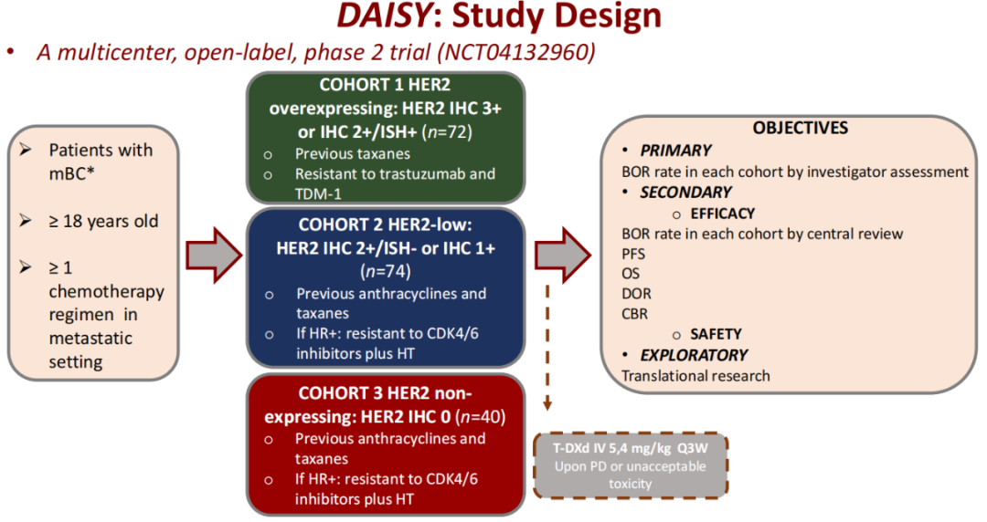 DAISY研究是一项多中心、开放标签的Ⅱ期试验,旨在通过广泛的生物标志物分析评估5.4 mg/kg剂量的单药T-DXd在晚期乳腺癌患者中的疗效。研究分为三个队列,分别为HER2过表达(IHC3+或IHC 2+/ISH+,队列1);HER2低表达(IHC2+/ISH-或IHC1+,队列2);HER2不表达(IHC0+,队列3)。主要研究终点是每个队列中研究者评估的最佳疗效(BOR),次要终点为中心评估的BOR,临床获益率(CBR),疗效持续时间(DoR),无进展生存期(PFS),总生存(OS)和安全性。