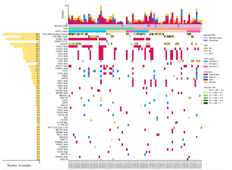 未发现T-DXd原发性耐药与频发性驱动基因变异相关,也未观察到ERBB2表达与T-DXd临床应答之间的相关性。基线时,88例患者中有5例(6%)检测到ERBB2杂合子缺失;其中4例对T-DXd治疗无反应(队列2中2例和队列3中2例)