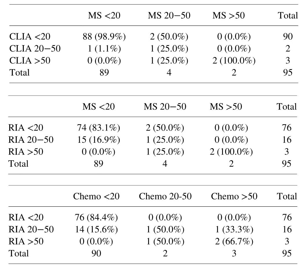 来自加拿大多伦多大学的Tiwari教授团队,在95例接受ADT治疗平均24.1个月的前列腺癌患者中首次比较了RIA、CLIA和MS三种常用检测方法测定的睾酮值的差异。根据每种方法的睾酮检测结果,将患者分为<20 ng/dl、20-50 ng/dl和>50 ng/dl三组,每组的患者比例分别为:CLIA法,94.7%、2.1%和3.2%;MS法,93.7%、4.2%和2.1%,RIA法,80.0%、16.8%和3.2%。RIA法与另外两种方法相比,<20 ng/dl组的患者比例有显著差异(p<0.001)。采用3x3表分析不同方法对患者分组的一致性,CLIA和MS的一致性为95.7%,加权的Fleiss Cohen kappa值为0.838(95%CI 0.656-1),MS和RIA以及RIA和CLIA之间分别为81.1%和0.504(95%CI 0.207-0.801)及83.2%和0.582(95%CI 0.336-0.828),详见表1。[1]