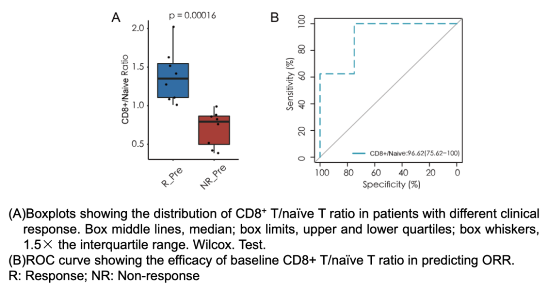 为了寻找疗效相关生物标志物,我们发现,基线CD8+T/Naïve T>1的患者更倾向于从该方案中获益。AUC=0.9662。