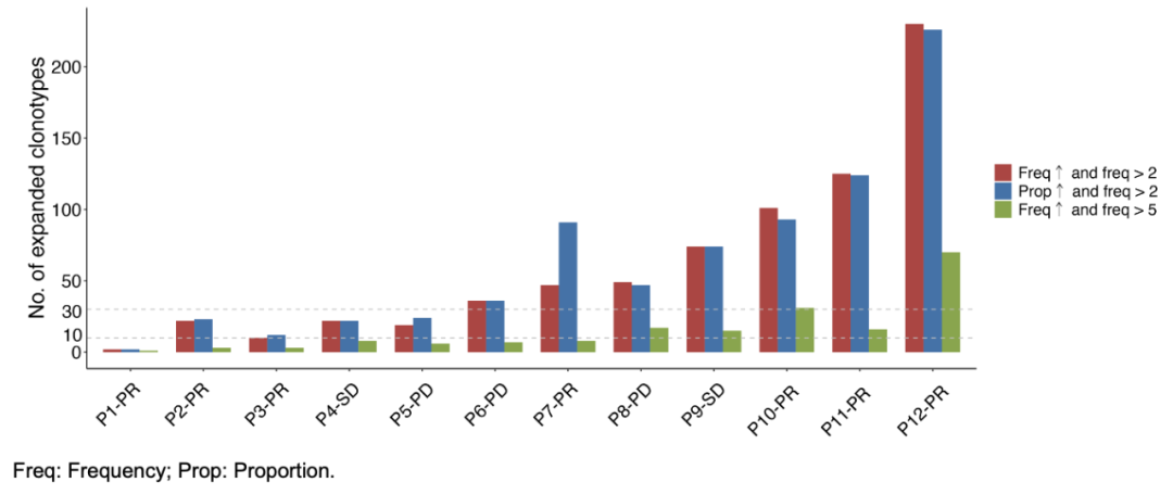 此外,我们分析了12个可用的配对样本,发现TCR扩增与临床疗效并无关联。