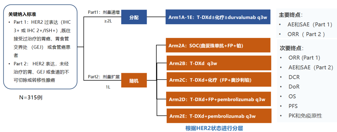 以T-DXd(DS-8201)为代表的抗体药物偶联物(ADC)药物在一线的探索也在进行中。2020年6月启动的DESTINY-Gastric03研究[12],是探索T-DXd一线治疗HER2阳性晚期胃癌的Ⅰ期/Ⅱ期临床试验,包括剂量递增部分和剂量扩展阶段,旨在评估T-DXd单药或联合化疗或联合免疫治疗的安全性和疗效(图1)。该研究预计在2023ASCO-GI披露Part 1数据,让我们拭目以待。