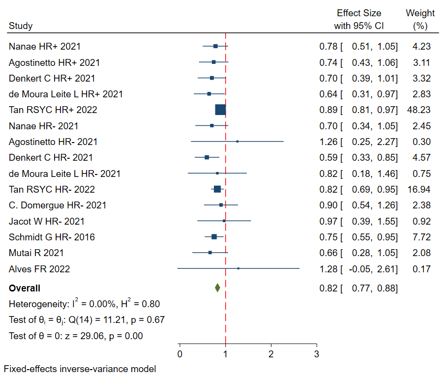 在亚组分析中,我们发现在激素受体阳性的乳腺癌患者中,HER2低表达的患者有更好的生存结果(OS:HR 0.85;95%CI:0.78~0.92;DFS/RFS:HR 0.90;95%CI:0.84~0.96)。同样,在三阴性乳腺癌患者中,我们也观察到了HER2低表达与更好的生存之间的正相关关系。(OS:HR 0.78;95%CI:0.69~0.87。0.69~0.87;DFS/RFS:HR 0.86;95%CI:0.77~0.94).(图3a和3b)