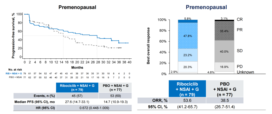 在这项桥接研究中,有156例初始治疗的绝经前HR+/HER2-ABC患者被纳入绝经前队列,随机(1:1)接受瑞波西利或安慰剂+NSAI+OFS(戈舍瑞林),研究结果显示达到了主要终点:瑞波西利组的PFS相较于安慰剂组延长了12.9个月(27.6 vs 14.7个月),疾病进展或死亡风险降低32.8%(HR 0.672,95%CI:0.448~1.009)。在次要终点方面,瑞波西利组的ORR相较于安慰剂组提高了15.1%(53.6%vs 38.5%),OS尚未成熟。在安全性方面,该桥接研究中瑞波西利的总体安全性与已知的安全性特征大致相似,并与全球研究(MONALEESA-7)基本一致,没有发生新的不良事件。