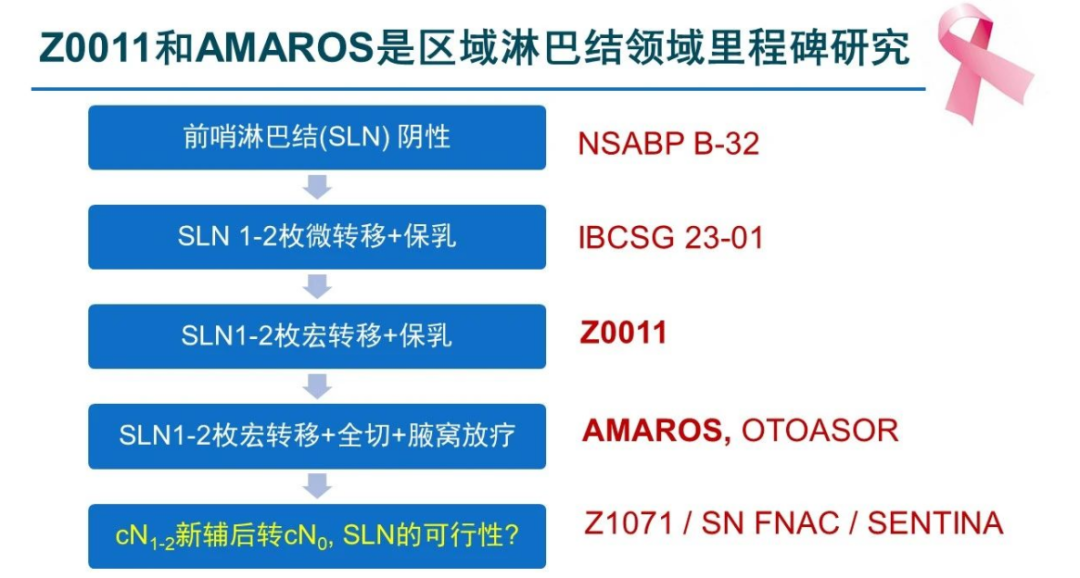 豁免腋窝淋巴结清扫(ALND)对提高乳腺癌患者的生活质量具有重要意义。余科达教授在讲课中首先对既往开展的相关研究进行了介绍:NSABP B-32研究证明了前哨淋巴结活检(SLN)阴性患者可以豁免ALND,IBCSG 23-01研究证实SLN 1-2枚微转移保乳患者不必行ALND。Z0011研究告诉我们,SLN 1-2枚宏转移保乳患者,可以豁免腋窝淋巴结清扫。AMAROS研究则证明了SLN 1-2枚宏转移患者,无论是行保乳手术还是全切手术,若术后行腋窝放疗,则可以豁免ALND。Z1071研究将进一步探讨cN1-2新辅助转为cN0患者的SLN可行性。