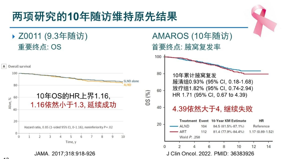 AMAROS研究最终结果显示,清扫组和放疗组5年腋窝复发率分别为0.43%和1.19%,虽远低于试验预设,但事实上放疗组的复发率是清扫组的2~3倍。此外,尽管预设的非劣边界高达2,但该研究最终的HR可信区间为0~5.27,远大于2,所以该研究的主要终点“腋窝复发率”失败了。虽然其次要研究终点DFS和OS结果相似,提示放疗的可替代性,但次要终点不能作为主要结论,腋窝复发率低不代表全面放弃主要终点。