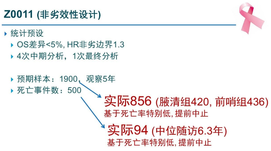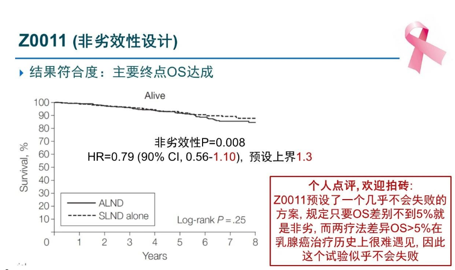 Z0011研究的终点设定为腋清组和仅前哨组的总生存(OS)率,腋清组5年OS率为80%,仅前哨组5年OS率不劣于75%,≤5%即认定为非劣效。然而在真实世界中,临床上两种药物或两种治疗手段的OS差异>5%的情况微乎其微,这样的设定意味着无论临床上如何操作,其OS差异都达不到5%以上,以5%作为非劣标准过于宽松。过于宽松的标准导致该临床研究提前终止,未能达到预期入组样本数和死亡事件数,也从设定之初就预示着该试验似乎不会失败。虽然Z0011研究结果得到了大家的认可,但个人认为其在研究终点的设定上存在问题。