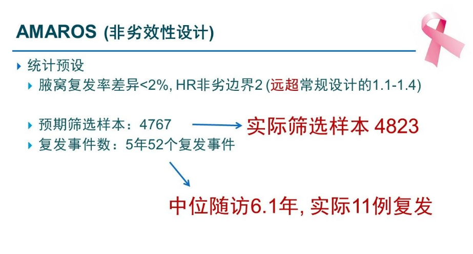 AMAROS研究的终点设计较Z0011更加客观,其终点为5年腋窝复发率(腋下/锁骨下/内乳,但不包含锁骨上淋巴结复发)。研究预设放疗组较腋清组的腋窝复发率<2%(腋清组2%,放疗组不超过4%,相差小于2%),而该预设在统计学上的HR非劣边界为2,远超常规设计的1.1~1.4。