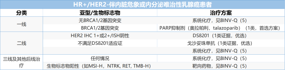 DESTINY-Breast04临床研究结果公布以后,NCCN指南快速进行了更新,新增T-DXd作为HER2低表达经过至少1线化疗患者的优选方案,其中HR+患者需要为内分泌难治(1类证据)(NCCN指南2023 v3相关推荐见下表)。