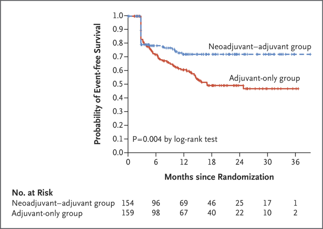 研究纳入了313例符合条件的黑色素瘤患者,其中154例患者被分配至新辅助-辅助治疗组,159例在单纯辅助治疗组。经过14.7个月的中位随访期,共有105例事件发生,其中新辅助-辅助治疗组38例,辅助治疗组67例。相较于单纯辅助治疗组,新辅助-辅助治疗组的EFS显著延长(HR 0.58,95%CI 0.39–0.87;P=0.004);新辅助-辅助治疗组患者的2年EFS率为72%(95%CI:64%-80%),单纯辅助治疗组为49%(95%CI:41%-59%)。在接受新辅助治疗的可评估患者中,分别有6%和41%达到CR和PR;当地机构病理学评估的pCR为21%;大多数患者(127/144,88%)接受了根治性手术。安全性方面,新辅助-辅助治疗组3级及以上相关不良事件发生率为12%,单纯辅助治疗组为14%,且没有发现新的毒性。