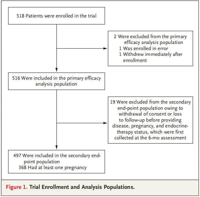 POSITIVE是一项单臂研究,纳入标准如下:年龄≤42岁,Ⅰ期、Ⅱ期或Ⅲ期HR阳性乳腺癌,接受了18~30个月的辅助内分泌治疗并且希望妊娠。主要终点是随访期间的乳腺癌事件数量,乳腺癌事件的定义为浸润性乳腺癌的局部、区域或远处复发或对侧新发浸润性乳腺癌。