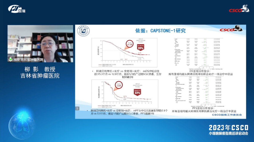 大会开篇,王绿化教授作为环节主持邀请程颖教授全面梳理2022年小细胞肺癌领域的重大事件。程颖教授强调,回首2022年,小细胞肺癌领域的首个大事件是CAPSTONE-1研究取得了瞩目成果,印证恒瑞公司自主研发的PD-L1抑制剂阿得贝利单抗在ES-SCLC一线治疗的价值。作为首个100%纳入中国人群的III期注册临床研究,CAPSTONE-1研究结果显示,阿得贝利单抗联合化疗组中位总生存期(mOS)达15.3个月,降低死亡风险达28%,中位无进展生存期(mPFS)为5.8个月,降低疾病进展风险达33%。基于出色成果,该研究在2022年美国癌症研究协会(AACR)上口头报告,并且全文发表在国际顶尖学术期刊Lancet Oncology。阿得贝利单抗于今年2月28日正式获批ES-SCLC一线治疗适应症,重塑ES-SCLC治疗格局。我国自主研发的斯鲁利单抗是目前全球唯一在小细胞肺癌领域取得阳性结果的PD-1抑制剂,也于今年年初获批相同适应症。ES-SCLC二线治疗中,芦比替丁在我国开展的桥接试验达到主要终点,基于此,其也被纳入新版指南推荐。此外,针对复发小细胞肺癌患者,靶向DLL3的双特异性T细胞连接器Tarlatamab、靶向B7H3的ADC药物也为该部分患者带来全新希望。