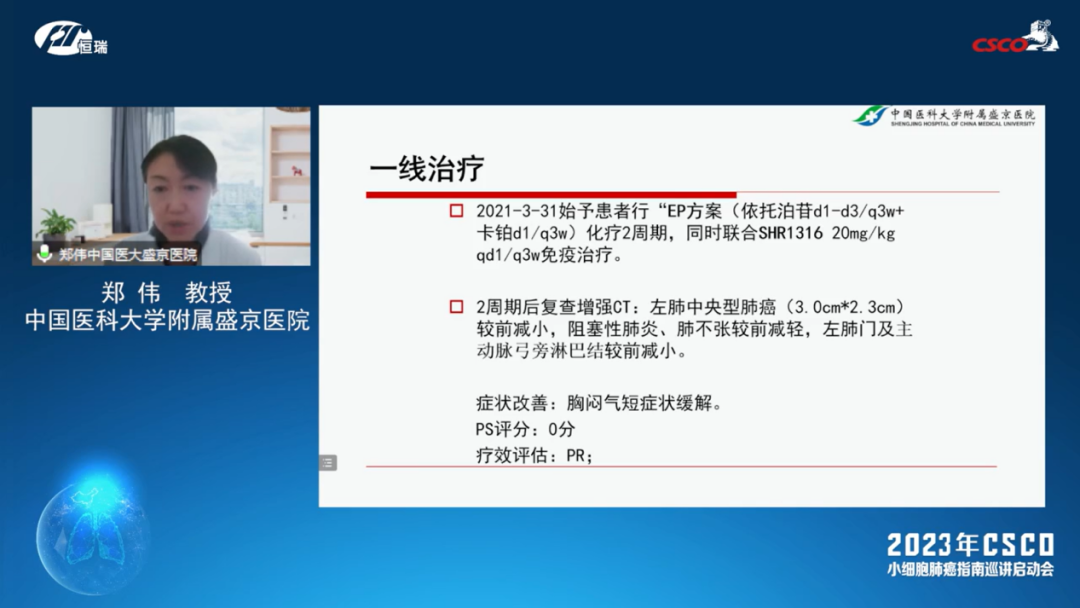 随后,中国医科大学附属盛京医院郑伟教授结合临床试验经验,将一例局限期小细胞肺癌患者的总体诊疗过程娓娓道来。该患者主诉胸闷气短加重一周,完善影像学检查后及病理诊断后确诊左肺中央型癌(小细胞肺癌局限期,T4N2M0,IIIb期)合并左门、主动脉弓旁淋巴结转移,基线靶病灶7.3cm*5.2cm。充分评估后,推荐患者入组SHR-1316-III-302临床试验,一线治疗应用阿得贝利单抗联合EP化疗2周期,后影像学检查发现靶病灶显著缩小至3.0cm*2.3cm,转移淋巴结均减小,胸闷气短症状缓解,疗效评估为PR。后依据试验设计方案,第3、4周期为患者行阿得贝利单抗+同步放化疗,复查后靶病灶进一步缩小至2.4cm*2.0cm,疗效评估维持PR。放化疗结束后,行阿得贝利单抗维持治疗至今,期间定期复查疗效评估维持PR,肿瘤控制稳定。截至2023年4月,该患者一线治疗效果显著,PFS超24个月,且安全可耐受。