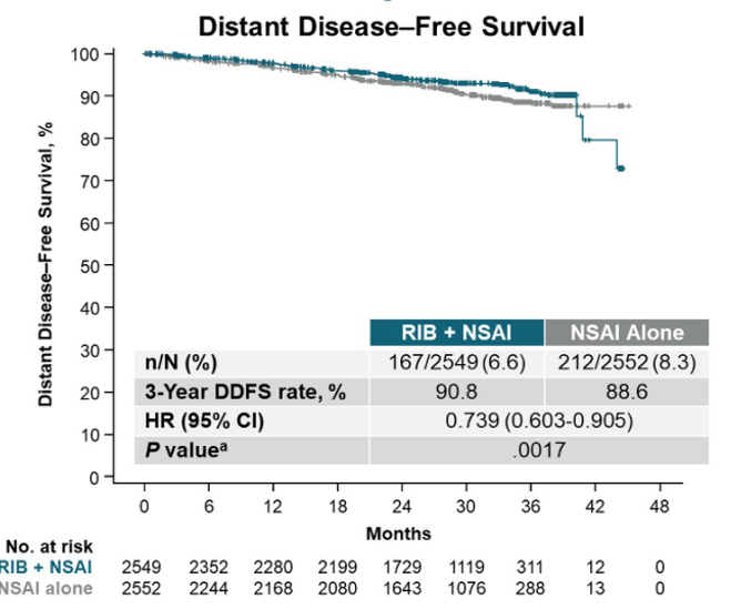 Dennis J.Slamon教授:NATALEE研究评估了内分泌治疗联合三种已获批的CDK 4/6抑制剂之一的瑞波西利(ribociclib)在早期乳腺癌患者治疗中的疗效,以观察瑞波西利联合内分泌治疗是否可以减少疾病复发并改善生存率。研究结果表明,与单独使用内分泌治疗相比,瑞波西利联合内分泌治疗可使患者的3年无浸润性疾病生存(iDFS)事件风险降低25.2%(HR=0.748;95%CI:0.618~0.906;P=0.0014);3年无远处疾病生存(DDFS)事件风险降低26%(HR=0.739;95%CI:0.603~0.905;P=0.0017)。其对总生存的影响目前还在进行中,数据仍不完备。不过随着患者随访的逐渐进行,数据正在慢慢累积。早期结果来看应用前景还是很不错的。