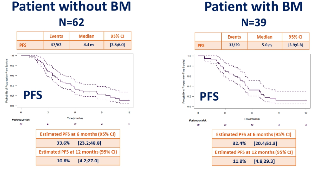 图5.T-DXd经治非脑转移(左)患者及脑转移患者(右)使用TTC方案的PFS