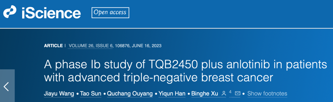 Wang J,Sun T,Ouyang Q,Han Y,Xu B.A phase Ib study of TQB2450 plus anlotinib in patients with advanced triple-negative breast cancer.iScience.2023 May 13;26(6):106876.doi:10.1016/j.isci.2023.106876.PMID:37275528;PMCID:PMC10238930.