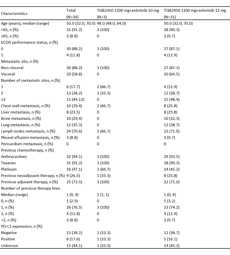 2019年5月29日至2020年9月28日,研究共入组34例晚期TNBC患者。在剂量递增阶段,3名患者接受10 mg安罗替尼联合1200 mg TQB2450,3名患者接受12 mg安罗替尼联合1200 mg TQB2450,均没有出现剂量限制性毒性(DLT)。因此,后续28名晚期TNBC患者在研究扩展阶段接受12 mg安罗替尼联合TQB2450治疗方案。患者的基线特征如下表显示: