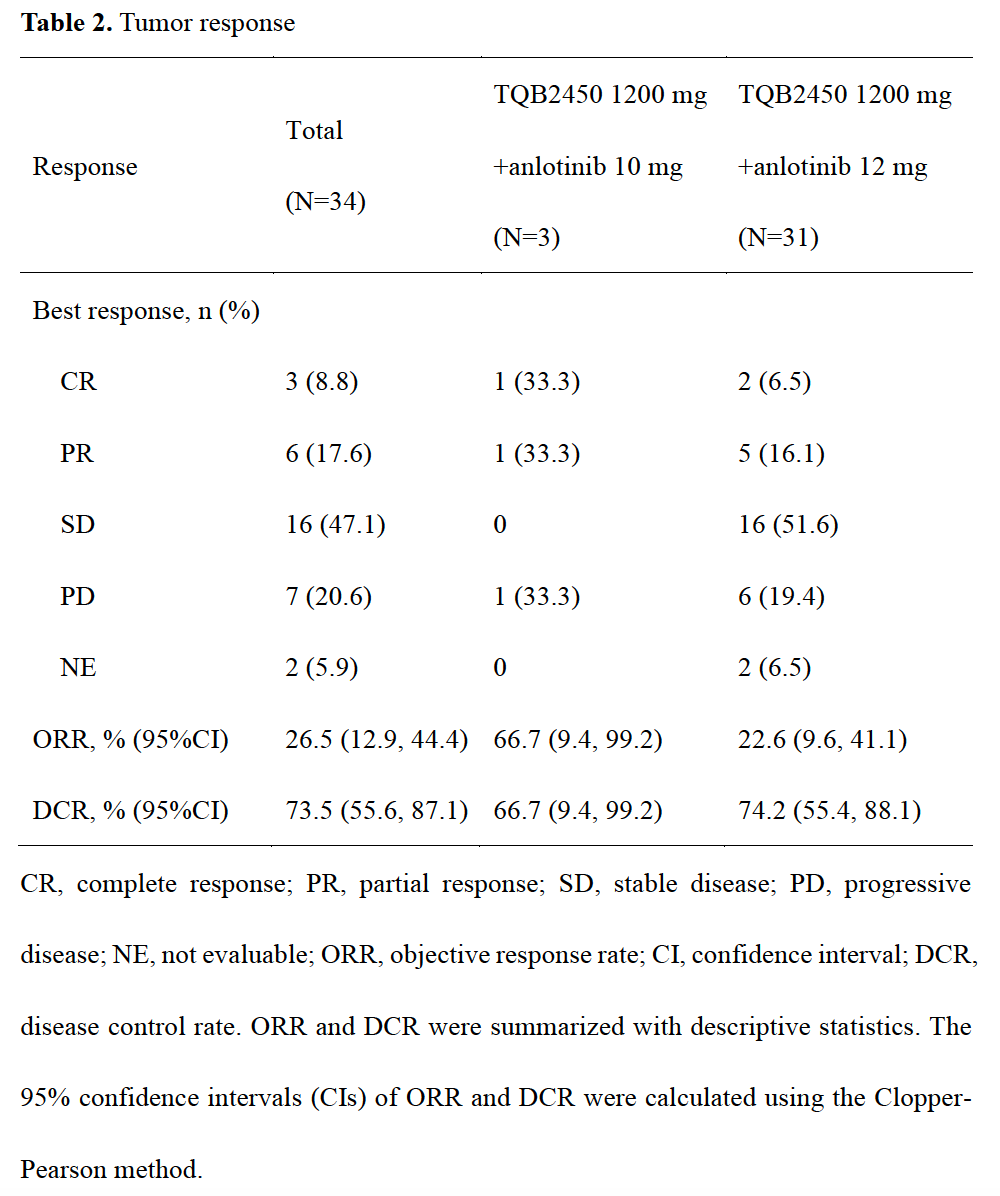 如下表所示,34名患者中有3名(8.8%)获得完全缓解(CR),6名(17.6%)获得部分缓解(PR),客观缓解率(ORR)为26.5%(95%CI,12.9-44.4)。疾病控制率(DCR)为73.5%(95%CI,55.6-87.1)。总人群、10 mg安罗替尼组患者和12 mg安罗替尼组患者的疾病进展(PD)率分别为20.6%、33.3%和19.4%。