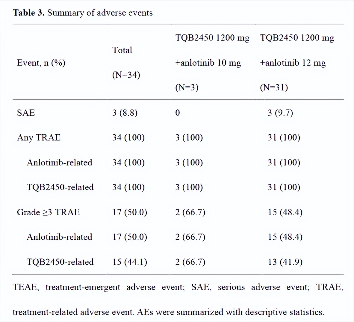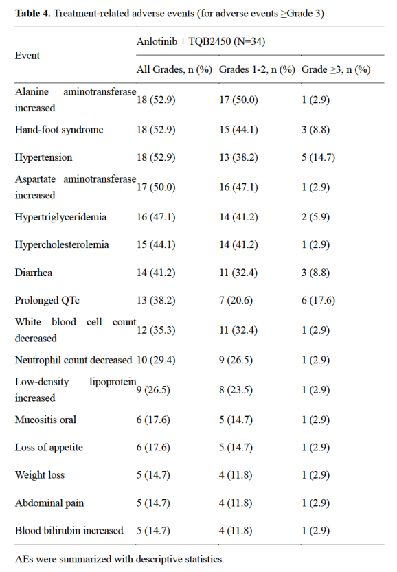在34名患者中,17名(50.0%)发生≥3级的治疗相关不良事件(TRAE)。包括QT间期延长(n=6[17.6%])、高血压(n=5[14.7%])、手足综合征(n=3[8.8%])、腹泻(n=3[8.8%])、高甘油三酯血症(n=2[5.9%])、高胆固醇血症(n=1[2.9%])、中性粒细胞计数减少(n=1[2.9%])、口腔粘膜炎(n=1[2.9%])、食欲不振(n=1[2.9%])、体重减轻(n=1[2.9%])、丙氨酸转氨酶(ALT)升高(n=1[2.9%])、天冬氨酸转氨酶(AST)升高(n=1[2.9%]),白细胞减少(n=1[2.9%]),腹痛(n=1[2.9%]),血胆红素升高(n=1[2.9%])(表4)。没有发生与治疗相关的死亡。