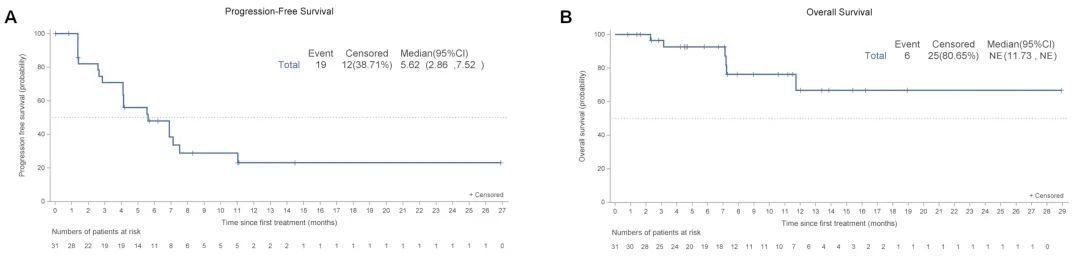 总人群中,患者中位PFS为5.6个月(95%CI,2.9-7.5),中位DoR暂未达到(95%CI,4.5-未达到)。总人群6个月的PFS率为49.9%(95%CI,31.1-66.1)。疗效达到CR或PR的患者中位PFS长于疾病稳定(SD)的患者(未达到[95%CI,7.1-未达到]vs 5.6个月[95%CI,4.1-6.9],P=0.001)。中位OS目前尚未达到(95%CI,11.7-未达到),如线图所示。