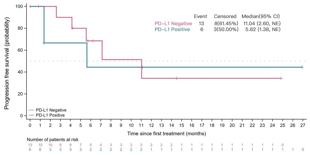 在本研究的34名患者中,6名患者为PD-L1阳性,13名患者为PD-L1阴性。PD-L1阳性患者的中位PFS(5.6个月[95%CI,1.38-未达到])在数值上低于PD-L1阴性患者(11.0个月[95%CI,2.6-未达到])。PD-L1阳性和PD-L1阴性患者的6个月PFS率分别为44.4%(95%CI,6.6-78.5)和68.6%(95%CI,30.5-88.7)。但需注意PD-L1阳性患者数较少,且15名患者PD-L1状态未知,故患者PD-L1表达状态与疗效的相关性仍需进一步研究探索。