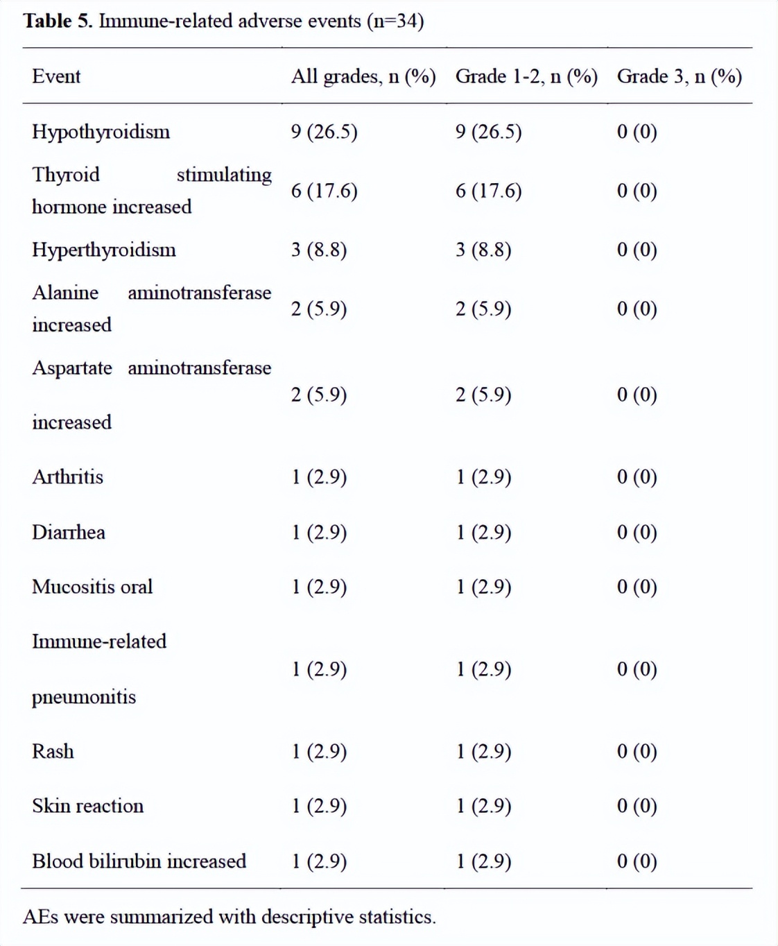 发生率≥5%的最常见免疫相关AE(irAE)包括甲状腺功能减退症(n=9[26.5%])、促甲状腺激素升高(n=6[17.6%])、甲状腺功能亢进症(n=3[8.8%])、ALT升高(n=2[5.9%])和AST升高(n=2[5.9%])。没有发生≥3级的irAE。