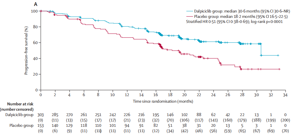 达尔西利联合来曲唑在HR+晚期乳腺癌的一线治疗的DAWNA-2研究也获得了令人鼓舞的结果,PFS延长了12.4个月(30.6 vs. 18.2个月),HR=0.51,降低了49%的疾病进展风险(图3),DAWNA-2研究刷新了CDK4/6抑制剂联合非甾体类芳香化酶抑制剂一线治疗HR+/HER2-晚期乳腺癌的PFS和ORR记录,为药物的临床应用提供了强有力的循证证据。该结果已经于2023年5月在线发表在《柳叶刀·肿瘤学》(The Lancet Oncology,影响因子51.1)。