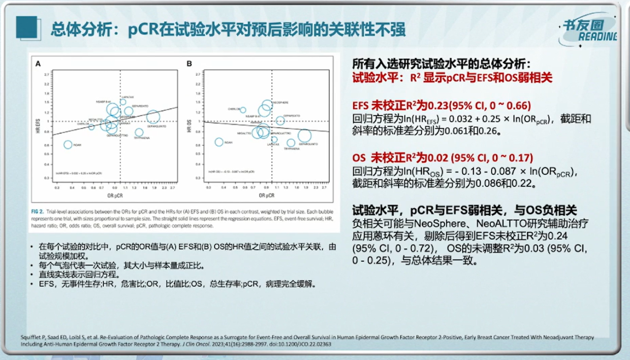 张强教授在讲课中还提到,新辅助治疗在提高早期HER2阳性乳腺癌治愈方面极为关键。相关研究证实了早期HER2阳性乳腺癌中pCR在患者水平对EFS和OS的优势作用。一项纳入了11项HER2阳性早期乳腺癌新辅助治疗的RCT研究描述了pCR在HER2阳性乳腺癌的预后作用和特点,并探索了其影响因素。