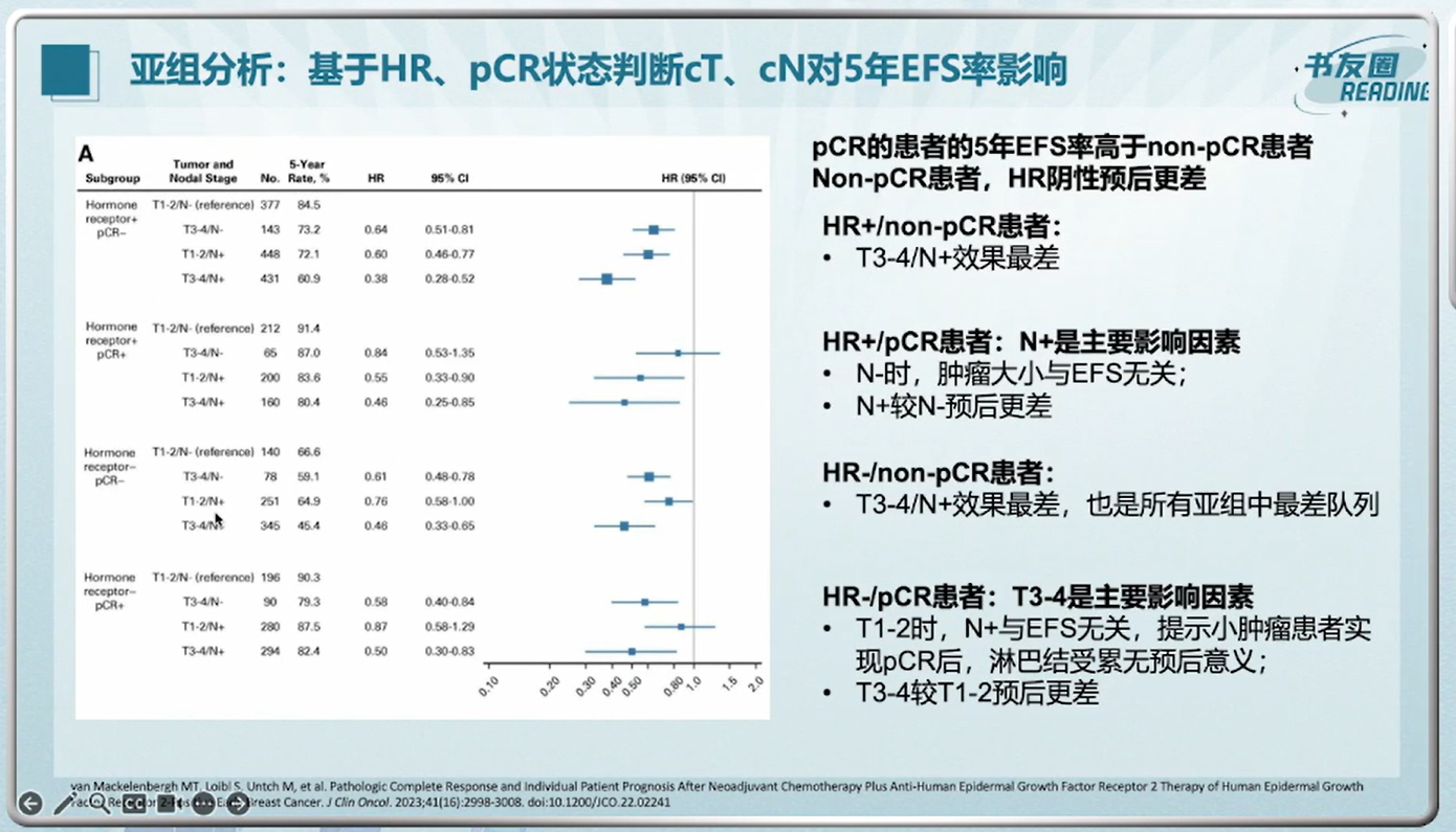 该研究纳入患者的中位年龄为49岁(范围18~81岁),56.7%的患者为肿瘤分期cT1-2,64.9%的患者诊断时淋巴结受累,54.9%的患者激素受体阳性。结果显示,HER2阳性乳腺癌新辅助治疗pCR患者较non-pCR的EFS、OS获益更多。对于pCR患者来说,cT、cN是EFS独立预后因素,cT是OS独立预后因素;对于Non-pCR患者来说,cT、cN、HR状态均为EFS和OS独立预后因素。因此,并非所有患者在pCR后都表现良好,需准确识别风险因素并精确予以治疗升级。