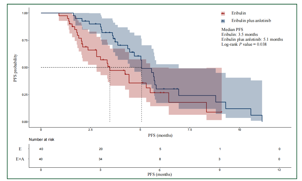 图2.接受艾立布林单药治疗或安罗替尼联合艾立布林治疗患者的无进展生存期
