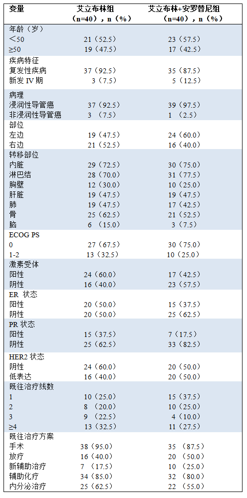 2020年6月至2022年4月共纳入80名患者,并随机接受治疗。其中,40名患者接受艾立布林单药治疗,40名患者接受安罗替尼联合艾立布林治疗(图1)。治疗组之间的基线特征基本平衡(表1)。其中73.8%(59/80)的患者有内脏转移,51.3%(41/80)的患者为HR阳性。接受二线、三线、四线、四线及以上治疗的患者占比分别为31.3%(25/80)、22.5%(18/80)、16.3%(13/80)和30.0%(24/80)。