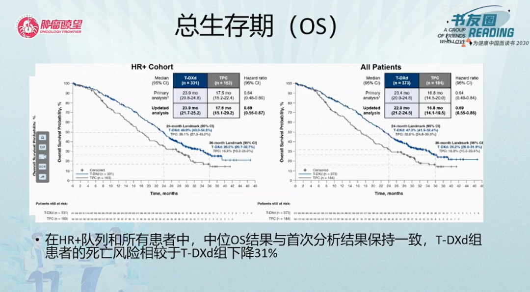 中位随访32.0个月(95%CI:31.0~32.8个月),T-DXd组和TPC组患者的中位治疗持续时间分别为8.2个月(范围:0.2个月~39.1个月)vs 3.5个月(范围:0.3个月~19.7个月)。总生存数据显示,在HR+队列中,T-DXd vs TPC组:23.9个月(95%CI:21.7~25.2)vs 17.6个月(95%CI:15.1~20.2)(HR 0.69,95%CI:0.55~0.87)。所有患者中,T-DXd vs TPC组:22.9个月(95%CI:21.2~24.5)vs 16.8个月(95%CI:14.1~19.5)(HR 0.69,95%CI:0.55~0.86);在HR+队列和所有患者中,中位OS结果与首次分析结果保持一致,T-DXd组患者的死亡风险相较于T-DXd组下降31%。