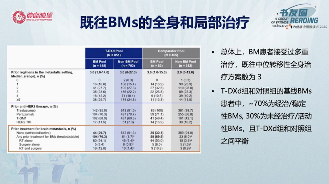 既往脑转移患者的全身和局部治疗情况:总体上,脑转移患者接受过多重治疗,既往中位转移性全身治疗方案数为3。T-DXd组和对照组的基线脑转移患者中,约70%为经治的/稳定性脑转移,30%为未经治的/活动性脑转移,且T-DXd组和对照组之间平衡。