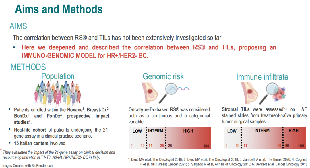 编者按:HR+/HER2-乳腺癌患者辅助治疗的前景已经发生了深刻的变化,也受到基因表达测定发展的推动,Oncotype DX是与最高质量证据相关的基因组分析之一,因此强烈推荐使用它来指导治疗决策。2023年ESMO大会上,来自意大利的研究团队深化和描述了RS和TILs之间的相关性,并提出了一个针对HR+/HER2-乳腺癌的免疫基因组模型(242MO)。本文特将该研究进行编译。
