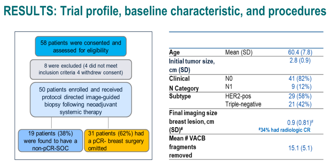 三阴性乳腺癌(TNBC)和HER2+乳腺癌(HER2+BC)的新辅助全身治疗(NST)在大约60%的患者中产生病理完全缓解(pCR)。NST的pCR预示着良好的预后,可通过经皮图像引导的真空辅助核心活检(VACB)准确确定。这项研究探索在新辅助全身疗法(NST)后取得病理学完全缓解(pCR)的三阴性乳腺癌(TNBC)或HER2+BC患者中豁免手术的疗效。其主要目标是评估具有VACB确定的pCR患者在接受放疗的情况下是否可以不进行后续的乳腺手术。纳入标准包括年龄≥40岁的女性、单中心TNBC或HER2+浸润性癌且肿瘤直径<5cm、N0/N1(超声活检疑似异常淋巴结≤4个)、接受过可选的临床NST,最终乳房影像学检查显示肿瘤必须缩小至≤2厘米。排除标准包括既往同侧乳腺癌、怀孕、T3/T4疾病、乳腺癌临床进展>20%或有新的淋巴结转移以及远处转移。