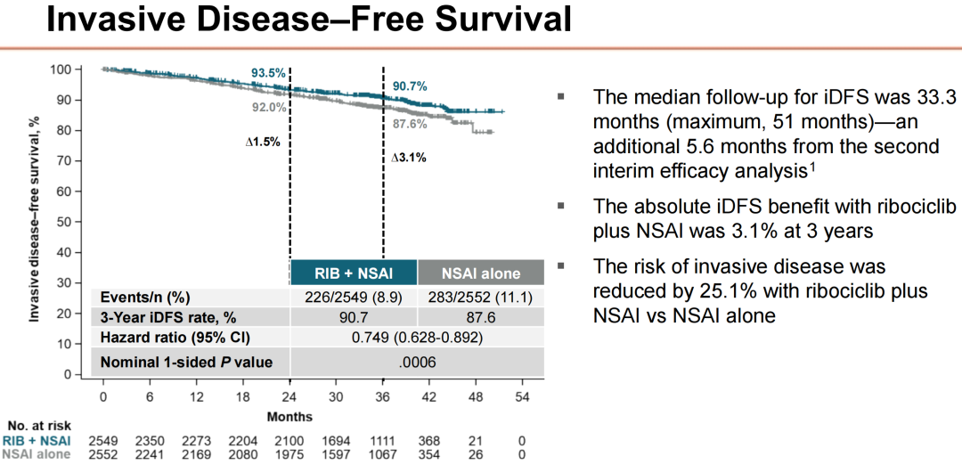 NATALEE试验的结果非常有希望,对照组和瑞波西利组之间的结果有明显的区别。此外,在最初的分析之后再随访6个月,观察到的益处不仅持续存在,而且在数量上也有所增加。例如三年时,瑞波西利的3年iDFS率绝对差异为提高3.1%,侵袭性疾病风险降低25%。