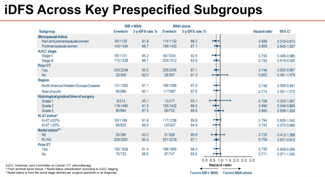 结果:截至2023年7月21日,RIB+NSAI组的2549例患者中,有1091例(42.8%)完成了3年的RIB治疗,905例(35.5%)停止了RIB或RIB+NSAI早期治疗,528例(20.7%)继续接受RIB治疗。NSAI组仍有1748例(68.5%)患者正在接受治疗。iDFS的中位随访时间为33.3个月,比之前的中期分析延长了5.6个月。共观察到509例iDFS事件,226例(8.9%)发生在RIB+NSAI组,283例(11.1%)发生在NSAI组。与单独使用NSAI相比,RIB+NSAI显示出显著的iDFS获益(HR 0.749,95%CI:0.628~0.892,P=0.0006)。3年iDFS率分别为90.7%(95%CI:89.3%~91.8%)和87.6%(95%CI:86.1%~88.9%)。各个亚组观察到一致获益,包括淋巴结阴性、II期或III期患者。次要终点DDFS和RFS同样以RIB+NSAI组更有利。OS数据尚不成熟,RIB+NSAI组和NSAI组分别有84例(3.3%)和88例(3.4%)死亡事件。自上次中期分析以来,未观察到新的安全性信号。在19.5%的患者中观察到因不良事件而中断RIB(较之前的中期分析增加<1%)。