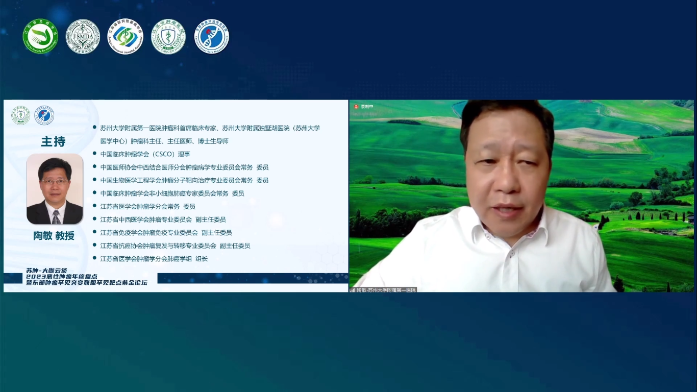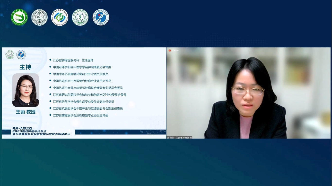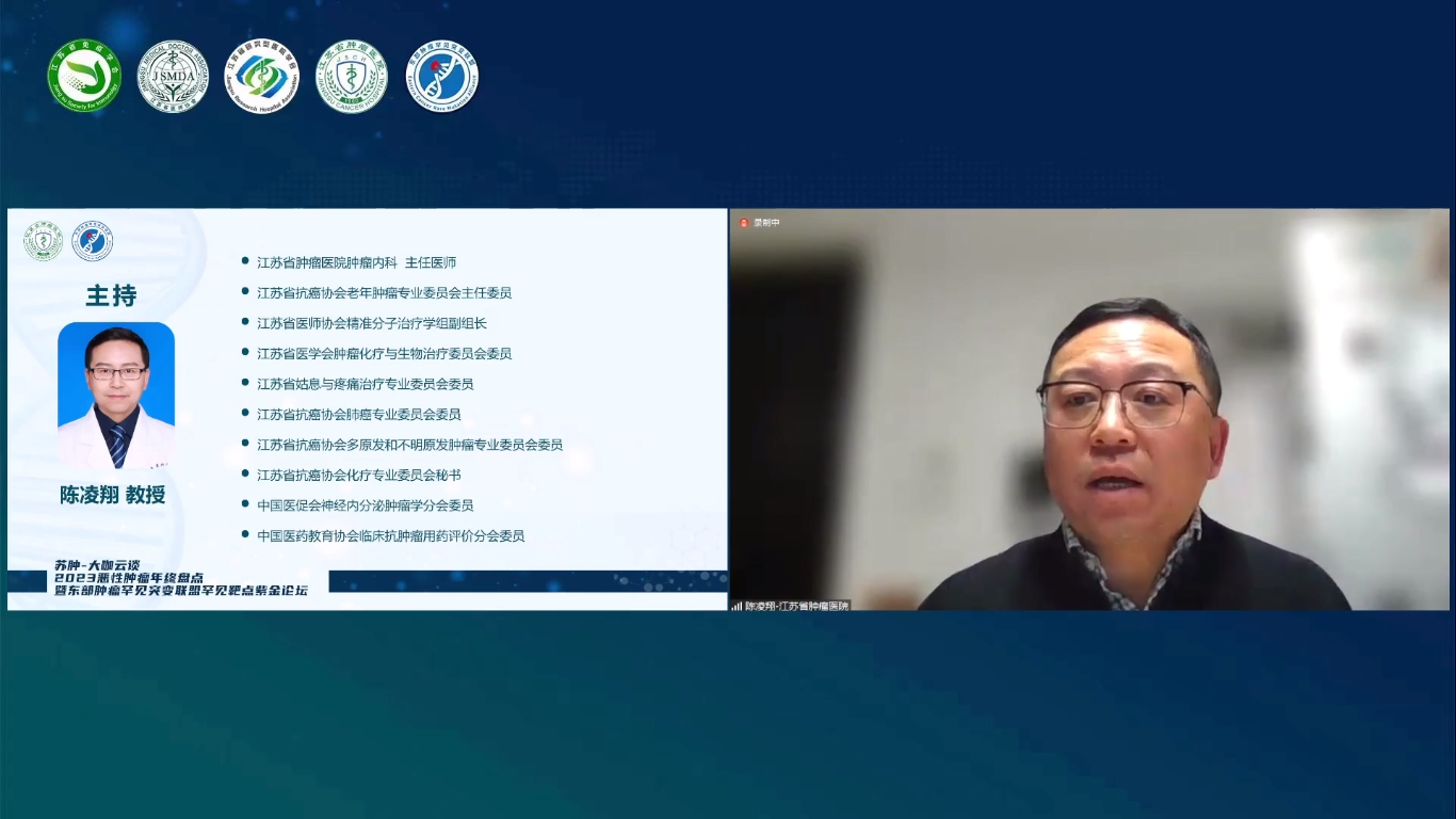 苏肿-大咖云谈2023恶性肿瘤年终盘点暨东部肿瘤罕见突变联盟罕见靶点紫金论坛于2023年12月24日以线上会议的形式顺利召开。此次大会由江苏省免疫学会转化医学分会、江苏省医师协会肿瘤多学科诊疗专委会、江苏省研究型医院学会肿瘤罕见突变专委会主办,南京医科大学附属肿瘤医院/江苏省肿瘤医院、江苏省肿瘤专业质控中心、东部肿瘤罕见突变联盟承办。本次会议分为两个篇章,其中上午场为实体瘤诊疗进展年终盘点,下午场为常见肿瘤罕见突变诊疗进展盘点。其中,实体瘤诊疗进展年终盘点专场(上午场)由江苏省肿瘤医院冯继锋教授、中国医学科学院肿瘤医院王洁教授、江苏省卫健委鲍军教授共同担任大会主席,包含8个专场学术报告;常见肿瘤罕见突变诊疗进展盘点专场(下午场)由徐州医科大学吕凌教授、江苏省肿瘤医院尹荣教授共同担任大会主席,包含7个专场学术报告,与会的各位专家共同分享了恶性肿瘤领域的新成果和新探索,为广大肿瘤领域科技工作者奉献了一场不容错过的学术盛宴。