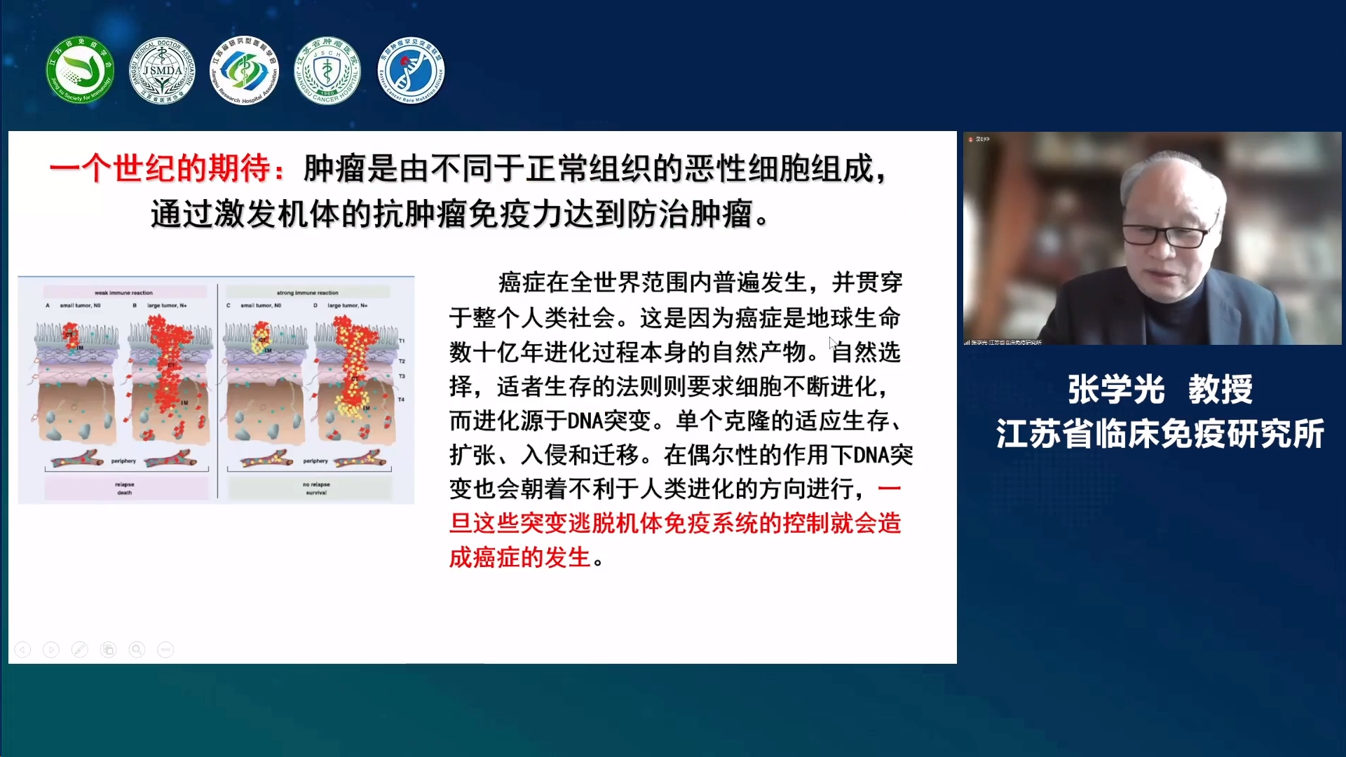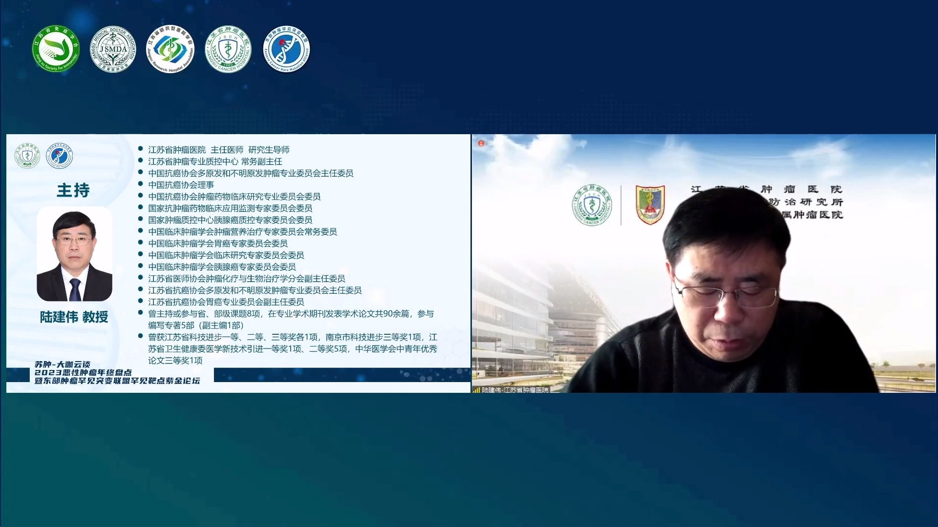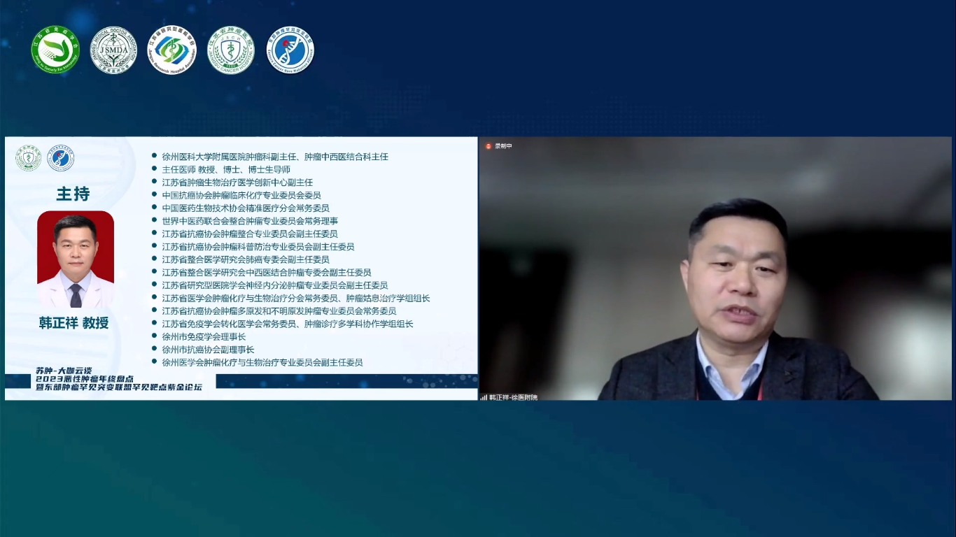 苏肿-大咖云谈2023恶性肿瘤年终盘点暨东部肿瘤罕见突变联盟罕见靶点紫金论坛于2023年12月24日以线上会议的形式顺利召开。此次大会由江苏省免疫学会转化医学分会、江苏省医师协会肿瘤多学科诊疗专委会、江苏省研究型医院学会肿瘤罕见突变专委会主办,南京医科大学附属肿瘤医院/江苏省肿瘤医院、江苏省肿瘤专业质控中心、东部肿瘤罕见突变联盟承办。本次会议分为两个篇章,其中上午场为实体瘤诊疗进展年终盘点,下午场为常见肿瘤罕见突变诊疗进展盘点。其中,实体瘤诊疗进展年终盘点专场(上午场)由江苏省肿瘤医院冯继锋教授、中国医学科学院肿瘤医院王洁教授、江苏省卫健委鲍军教授共同担任大会主席,包含8个专场学术报告;常见肿瘤罕见突变诊疗进展盘点专场(下午场)由徐州医科大学吕凌教授、江苏省肿瘤医院尹荣教授共同担任大会主席,包含7个专场学术报告,与会的各位专家共同分享了恶性肿瘤领域的新成果和新探索,为广大肿瘤领域科技工作者奉献了一场不容错过的学术盛宴。