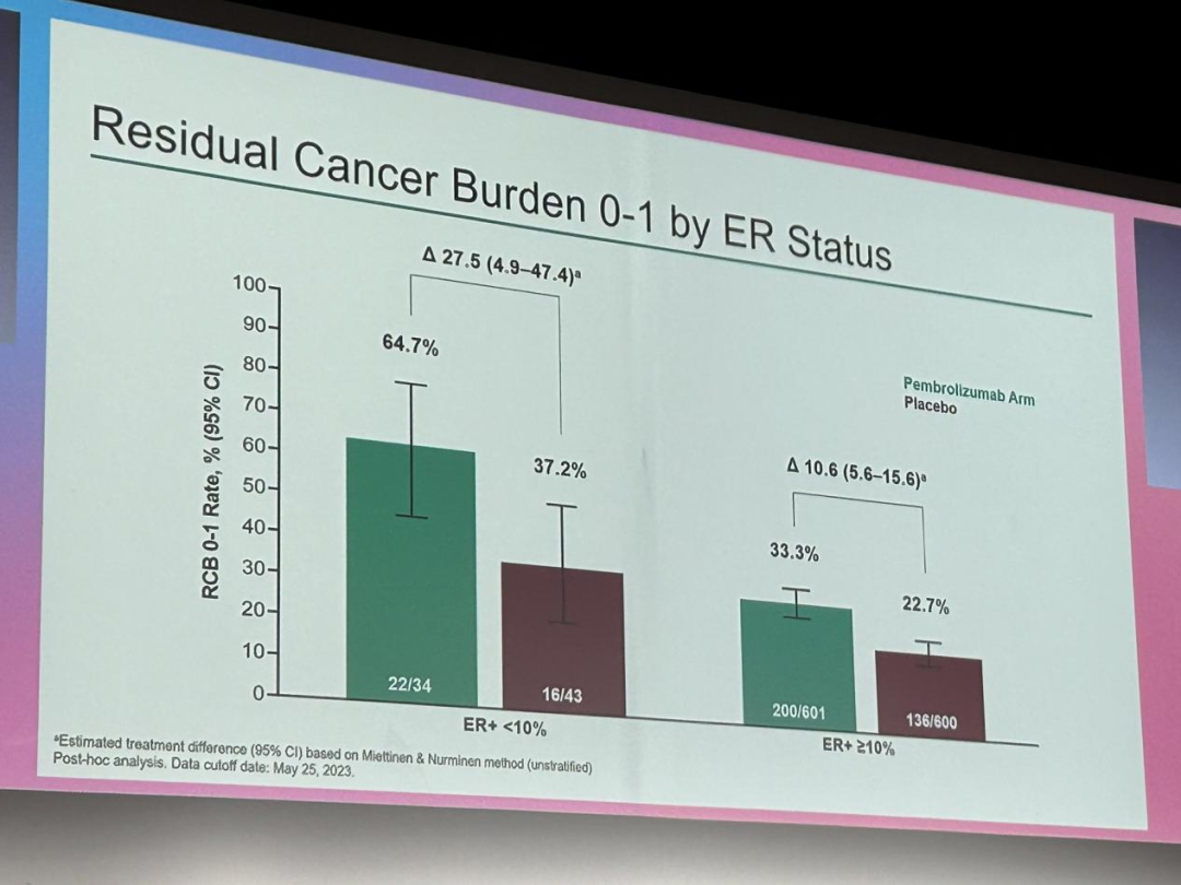 该研究根据患者ER阳性细胞表达<10%或≥10%进行了分层。发现ER+<10%的患者中,64.7%(22/34)接受帕博利珠单抗治疗的患者RCB状态为0-1,而接受安慰剂治疗的患者RCB状态为0-1的比例为37.2%(16/43)。在ER≥10%的患者中,33.3%(200/601)接受帕博利珠单抗治疗的患者RCB状态为0-1,而接受安慰剂治疗的患者RCB状态为0-1的比例为22.7%(136/600)。