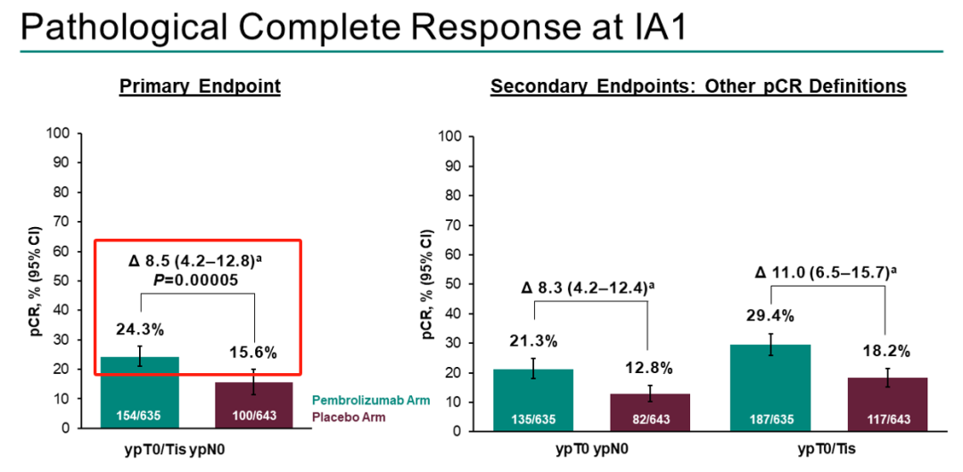 病理报告发现,接受帕博利珠单抗治疗的患者中,有35%(222例)的患者没有或只有极少量的癌细胞残留(RCB 0-1),而接受安慰剂治疗的患者中,这一比例为23.6%(152例)。在接受帕博利珠单抗治疗的患者中,40.8%(259例)的患者发现了中度癌细胞残留(RCB-2),接受安慰剂治疗的患者中,这一比例为45.3%(291例)。在接受帕博利珠单抗治疗的患者中,20.5%(130例)的患者发现了广泛的癌细胞残留(RCB-3),接受安慰剂治疗的患者中,这一比例为28.9%(86例)。