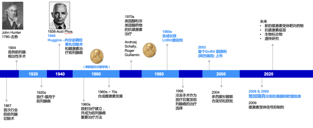 前列腺癌的内分泌治疗选择是一个古老且有着重要意义的问题。1941年Acid Phos教授揭示了前列腺癌与激素的关系,发现前列腺癌属于激素依赖性肿瘤,睾丸分泌的睾酮能够刺激前列腺癌细胞的增殖。随后,临床工作者发现,通过抑制体内的睾酮水平能够抑制前列腺肿瘤的发生发展,这便是前列腺癌内分泌治疗即雄激素剥夺治疗(ADT)的原理。随后,在GnRH类似物被发现后,长效GnRH制动剂、GnRH拮抗剂逐步问世,构成了目前ADT的治疗选择。图1为前列腺癌内分泌治疗发展历程。
