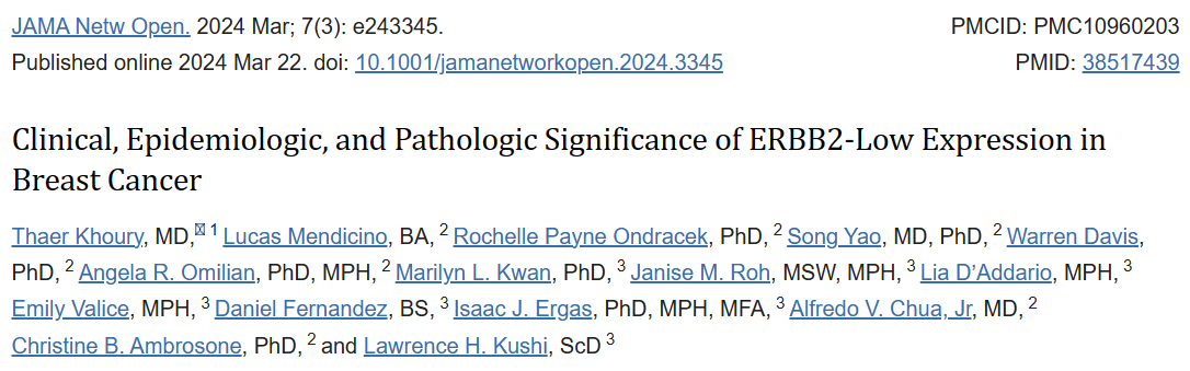 2.Khoury T,Mendicino L,Ondracek R P,et al.Clinical,Epidemiologic,and Pathologic Significance of ERBB2-Low Expression in Breast Cancer[J].JAMA Network Open,2024,7(3):e243345-e243345.