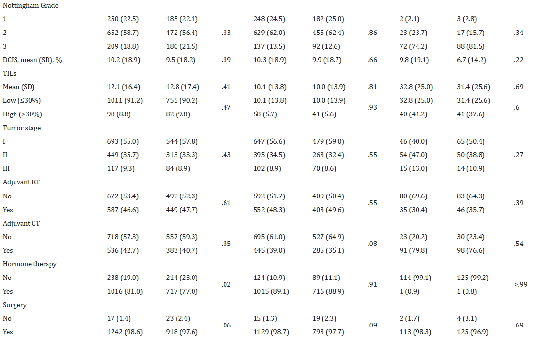 当肿瘤分类为IC-NST及其他类型时,ERBB2低表达与ERBB2阴性之间并无统计学差异。然而当单独分析单一类型时,ERBB2低表达在黏液性肿瘤(纯粘液性或混合微乳头状)中较少见(黏液性肿瘤38.5%vs.非黏液性肿瘤57.6%;P=0.02)。化生性乳腺癌常为ERBB2阴性,仅1/8名患者为ERBB2低表达。其他组织学特征(如诺丁汉分级和DCIS分型等)则与ERBB2并无统计学差异。TILs较高也与年龄较轻、绝经前状态、黑人、西班牙裔、BMI较高、激素受体阴性、IC-NST、诺丁汉分级较高或肿瘤分期较晚之间无统计学意义。此外,在激素受体阳性或激素受体阴性亚组,ERBB2阴性和ERBB2低表达之间的TILs也无统计学意义。