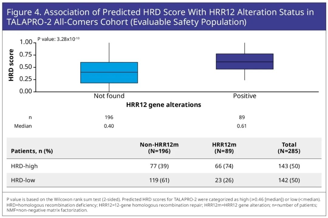 此HRD评分与HRR12m状态具有相关性,接受TALA+ENZA的患者,在HRD-高和HRD-低评分中均显示出更好的rPFS,在无HRR12突变的亚组中,TALA+ENZA组也存在优势。