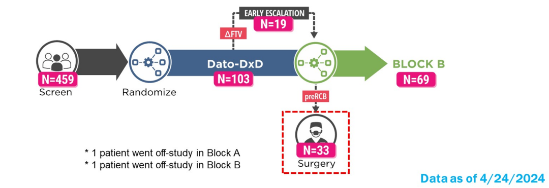 因此,这次ASCO大会报道的I-SPY 2.2研究,把目光聚焦在Dato-DXd之上。A阶段分别探讨了Dato-DXd单药或者联合Durva新辅助治疗的疗效和安全性,其中Dato-DXd单药队列的103例患者中有33例(32%)提前手术;Dato-DXd+Durva队列的106例患者中有35例(33%)提前手术。
